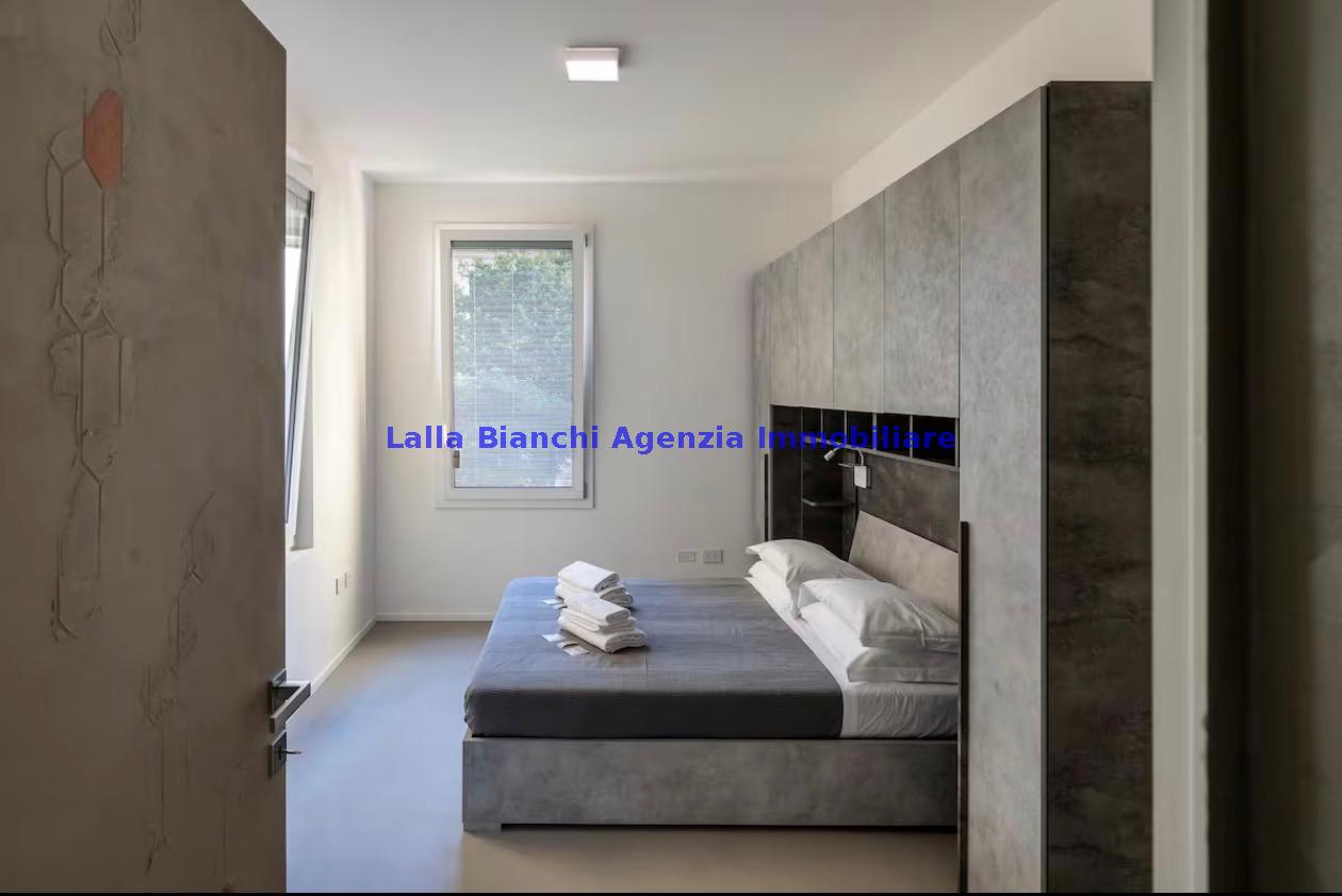L'immobile è completamente arredato, composto da ampia zona living con angolo cottura, disimpegno, bagno, camera matrimoniale con bagno privato, seconda camera; oltre che un vano tecnico sfruttabile anche come deposito bici. Al piano superiore collegato da ascensore interno troviamo una splendida terrazza allestita con tenda e barbecue.