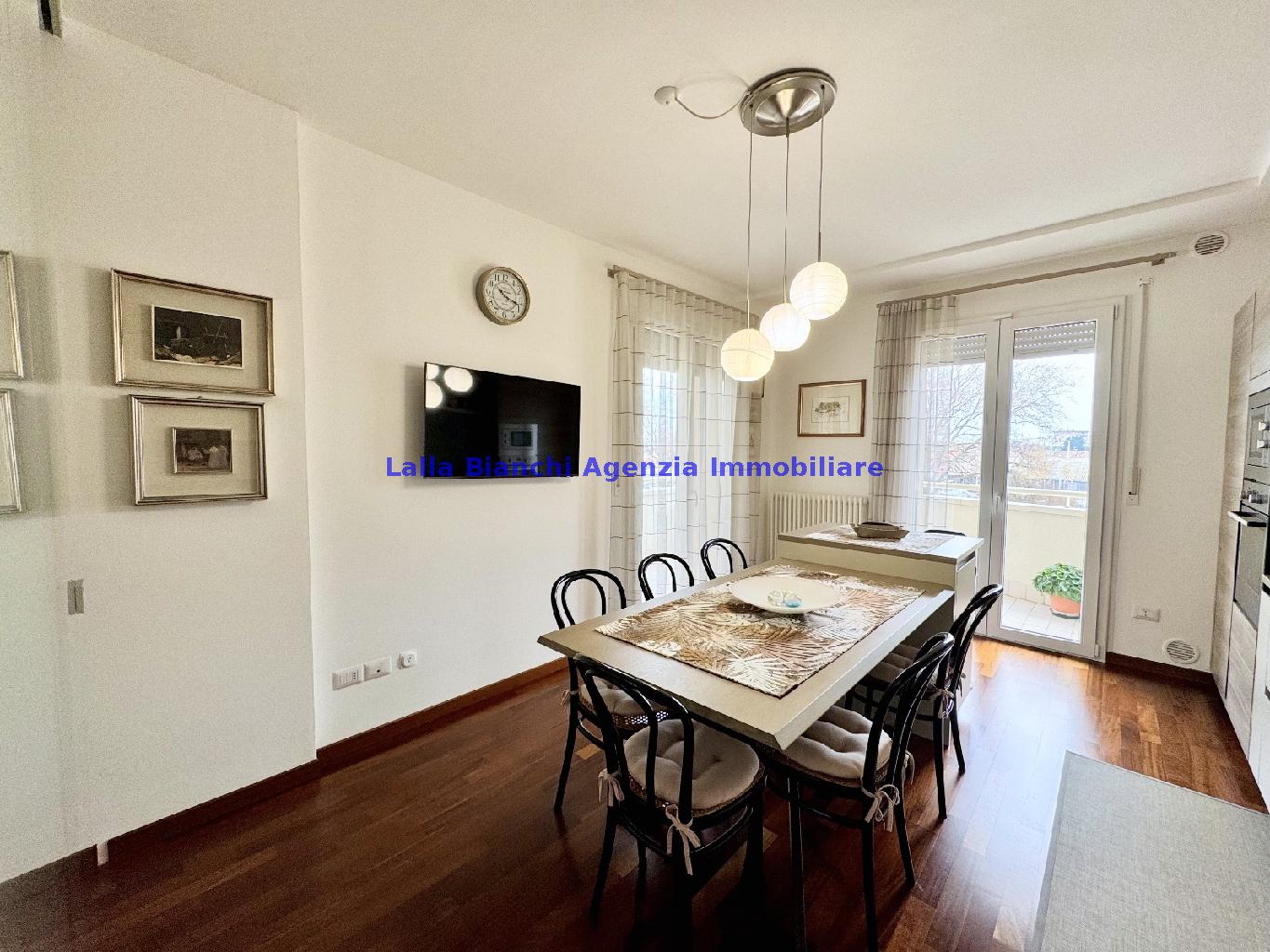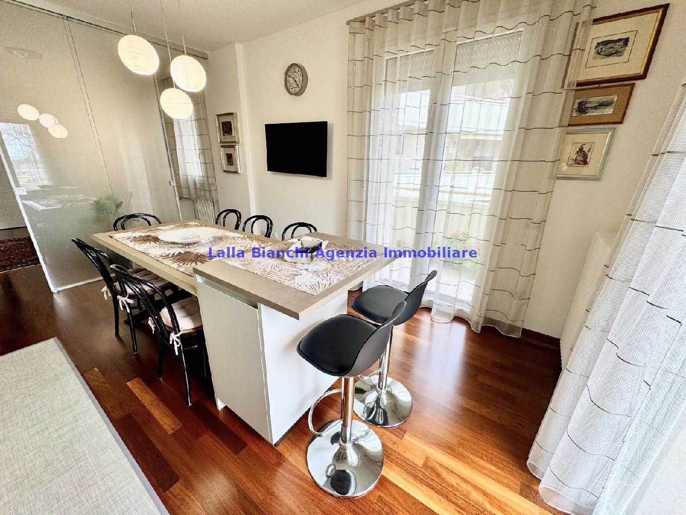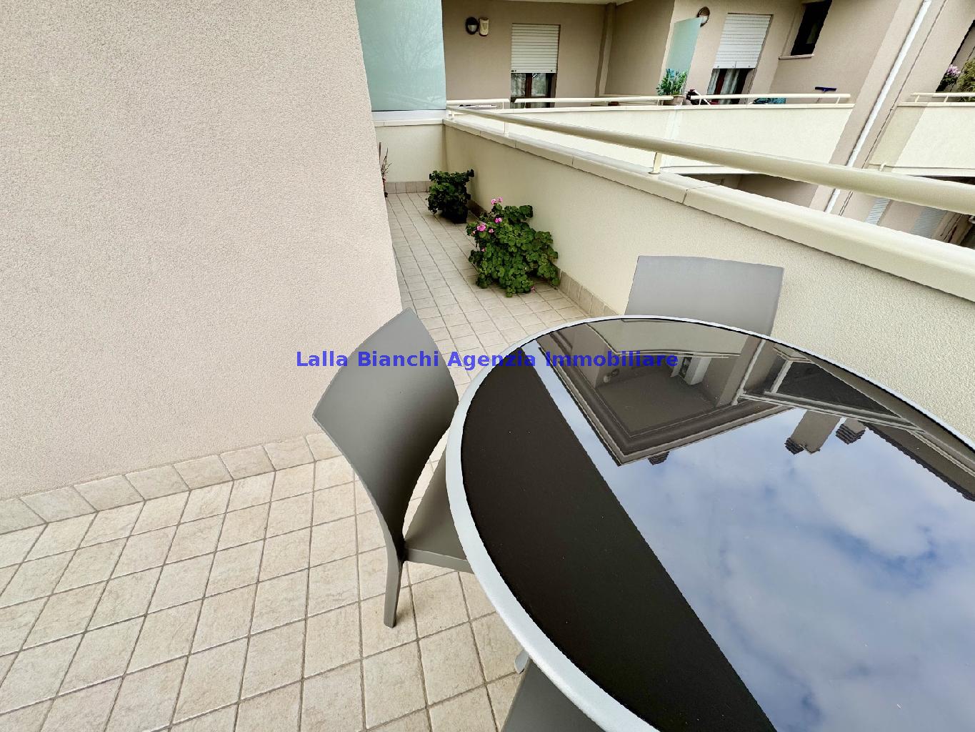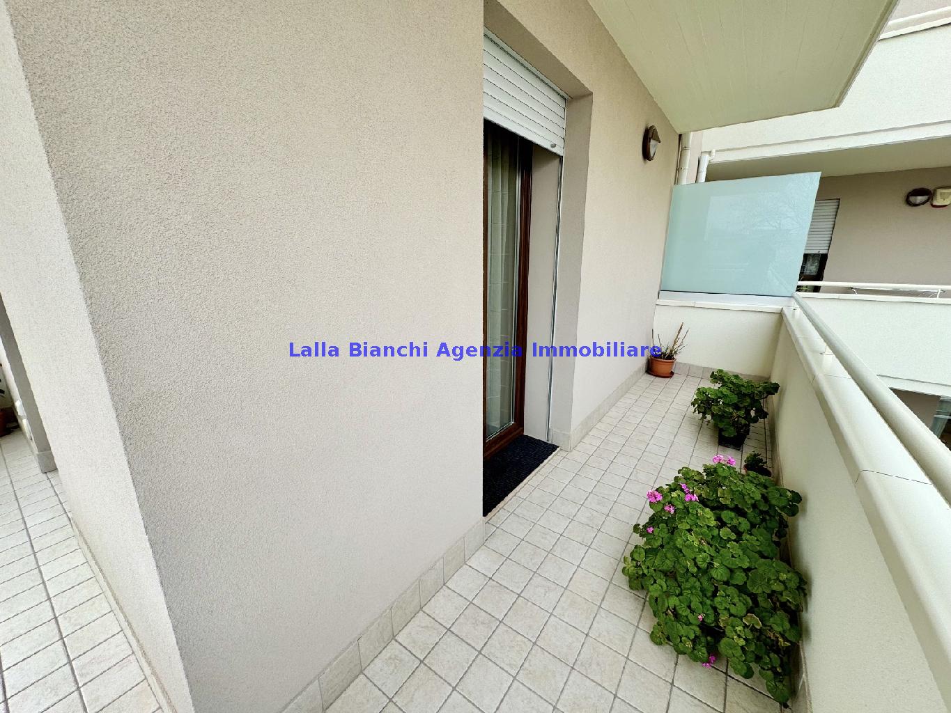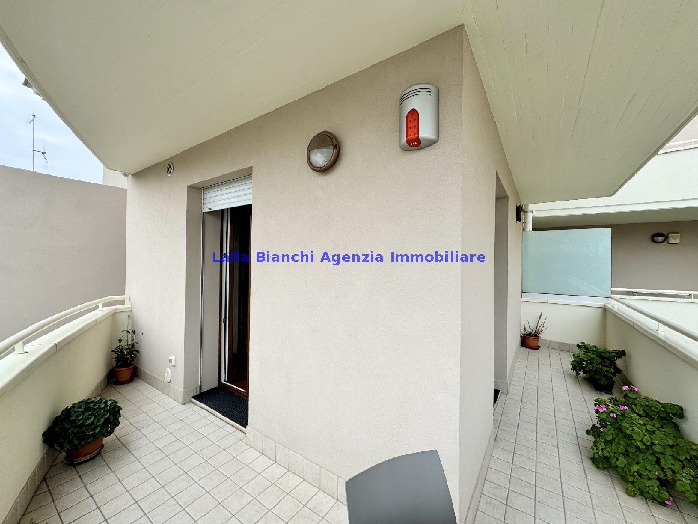 PESARO (PU) / BAIA FLAMINIA: COD. RIF. V. 9199 - L'AGENZIA IMMOBILIARE LALLA BIANCHI propone in VENDITA un elegante Appartamento semi nuovo con due terrazzi al Piano Secondo e un Garage esclusivo al Piano Interrato, all'interno di un recente e signorile piccolo condominio dotato di ascensore. L'abitazione di tipo civile situata al secondo piano di una palazzina residenziale di poche unità, ha una Superficie catastale Totale di 99 m² così suddivisa: - Zona giorno: ingresso diretto su un luminoso soggiorno separato dall'ampia cucina pranzo "abitabile" tramite una raffinata parete a due ante scorrevoli in vetro, da cui si accede ad un ampio terrazzo ideale per pranzi all'aperto. - Zona notte: un disimpegno che accompagna ad un bagno spazioso e finestrato con accesso esclusivo al secondo terrazzo, a due ampie camere da letto e ad una terza stanza attualmente adibita a lavanderia (e comoda dispensa). Completa la proprietà un comodo Garage di Superficie catastale Totale di 22 m² al Piano Interrato, raggiungibile direttamente con l'ascensore a norma disabili (assenza di barriere architettoniche) locato in una zona condominiale ben curata, inclusi ingresso, vano scala e parti comuni. L'appartamento, ultimato e rifinito nel 2019, si presenta in condizioni impeccabili, perfettamente mantenuto e pronto per essere abitato senza necessità di lavori, le finiture interne sono di alto livello, con pavimenti in parquet nella zona giorno e nelle camere, la residenza è dotata di video-citofono, di aria condizionata con tre split interni, impianto d'allarme/antifurto e portone blindato per la massima sicurezza. Le utenze sono autonome (riscaldamento, gas, luce e acqua) e le spese condominiali sono contenute, pari a circa 60 euro al mese. L'immobile rappresenta un'ottima opportunità sia come abitazione principale che come seconda casa o casa vacanze, grazie alla sua posizione strategica: a soli 5 minuti a piedi dalla spiaggia e dal mare di Baia Flaminia e a pochi passi dalla zona Mare e dal Centro Storico della città Pesaro, luoghi facilmente raggiungibili anche in bicicletta tramite la pista ciclabile che passa proprio di fronte alla casa proposta in Vendita.